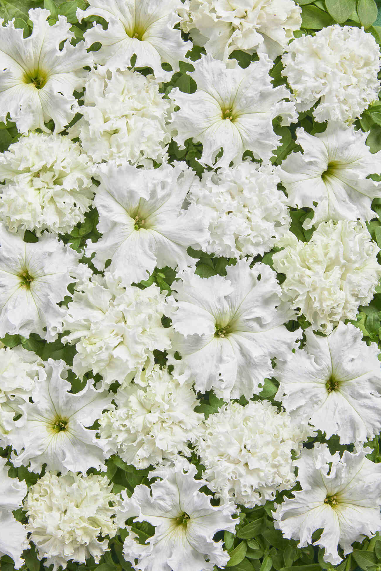 Крупноцветковая петуния белоснежной окраски, образующая интенсивно бахромчатые цветки. Желтый зев привлекает внимание с первого взгляда, эффектно контрастируя с белыми лепестками.