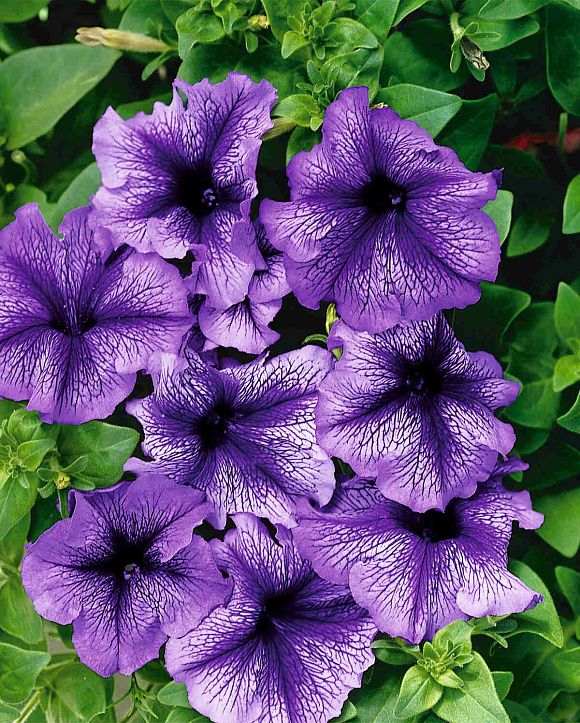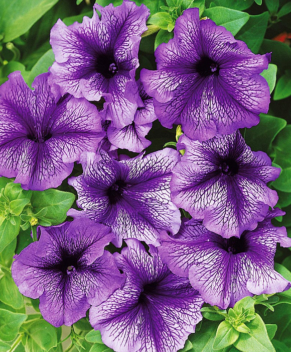 Эта группа занимает лидирующие позиции! Наибольшая гордость крупноцветковой петунии (грандифлора) — это крупные (диаметр 9-13 см!) цветы, простые или махровые с волнистыми краями, окрас от нежных пастельных оттенков до броских цветовых сочетаний. Куст пышный, ветвистый. Отличается ранним, обильным и продолжительным цветением.