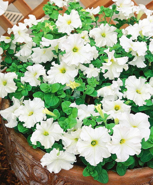 Эта группа занимает лидирующие позиции! Наибольшая гордость крупноцветковой петунии (грандифлора) — это крупные (диаметр 9-13 см!) цветы, простые или махровые с волнистыми краями, окрас от нежных пастельных оттенков до броских цветовых сочетаний. Куст пышный, ветвистый. Отличается ранним, обильным и продолжительным цветением.