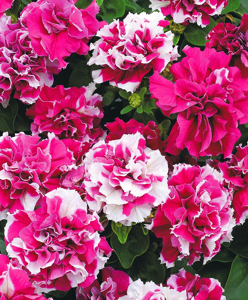 В эту группу можно смело отнести как многоцветковые, так и крупноцветковые петунии, но все они обязательно отличаются своей махровостью - цветки состоят не из 5, а из большего количества лепестков. Особую пышность имеют цветки с лепестками волнистой формы и бархатистыми краями. Разнообразная окраска махровых петуний может быть однотонной или с различными вкраплениями в виде цветовых пятен, прожилок или каймы, проходящей по краю лепестков.