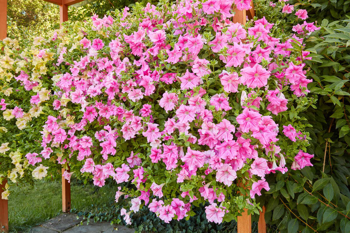 УХОД ЗА ПЕТУНИЕЙ В ГРУНТЕ. Уход за петунией в грунте заключается в регулярных умеренных поливах. В прополках и рыхлении она нуждается до того момента, пока она не заполнит собой сплошным ковром весь отведенный ей участок. Отцветшие цветки нужно своевременно удалять и за сезон несколько раз провести стрижку растений, после каждой стрижки петуния порадует вас вновь обильным кущением и цветением. Подкормки петунии, растущей в грунте в цветниках, нужны раз в 20 -30 дней любым минеральным комплексом для цветочных культур, предпочтительнее кормить по листу. Для петунии в клумбах с ограниченным объемом грунта, например клумба в шине, питание дают раз в 10 -14 дней. Для петуний, высаженных в небольшие кашпо или цветочные горшки, питание дают раз в 7 дней. Объем грунта в цветочном кашпо слишком мал, что бы надолго обеспечить обильное цветение без подкормок. Ампельные петунии любят покушать чаще всех, их кормят раз в 5 дней.