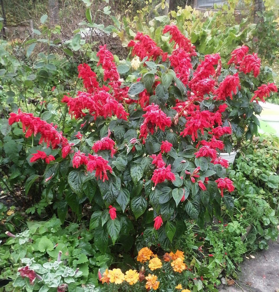 Одно плохо - не соответствует описанию. Я сажала эту сальвию в качестве бордюра в 20 см высотой, а вырос гигант! В середине сентября она была в метр высотой! Фото сделано 07.10.2023 г., здесь она уже немного поникла, но рядом виднеются бархатцы для сравнения, как раз высотой 20 см.