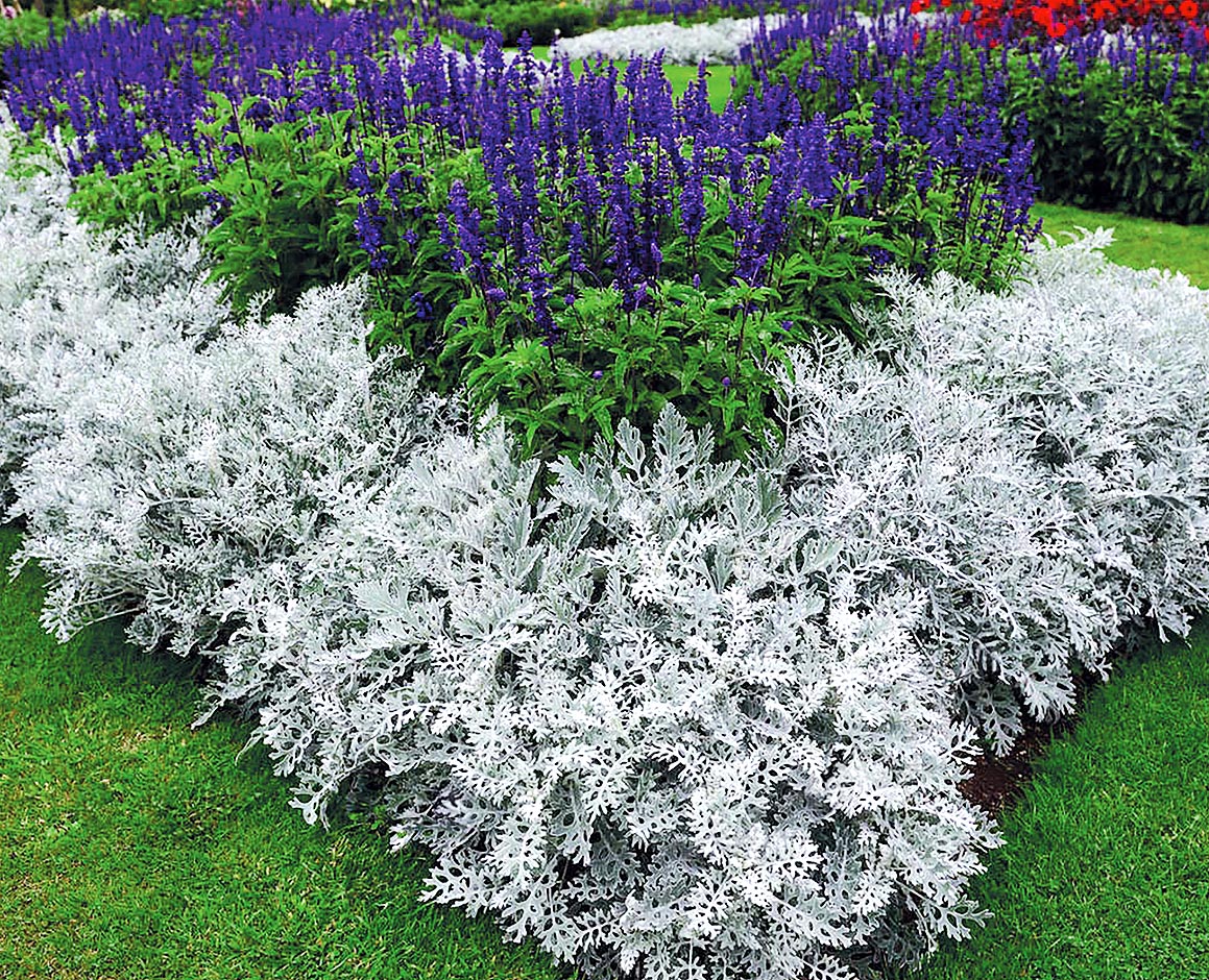 Это я говорю о цветке Цинерания из семейства астровых, это значит, что и грунт и питание мы будем ей готовить, как и астрам. Если астры мы ценим за красоту цветка, то цинерания покорила сердца цветоводов своими серебристыми узорчатыми листьями. Скромница цинерания, как бордюрная культура как раз то, что нам нужно. Она, как никто другой, подчеркнет красоту ярких красок ваших шикарных цветов и наоборот, выращенная в самостоятельных контейнерных посадках или кашпо, она придаст особый шарм отдельным уголкам сада. В тех же кашпо и контейнерах, перед наступлением заморозков, ее можно занести домой. До новой весны она станет элементом декора вашего дома, погружая вас в воспоминания о лете. Отлично будет смотреться на участке цинерания Серебряный дождь в групповых посадках с петунией, бархатцами, яркой календулой и многими другими любимцами вашего сада. Особый шик цветнику, как оригинальное дизайнерское решение, придаст композиция - огненная Сальвия в обрамлении серебристой цинерании.