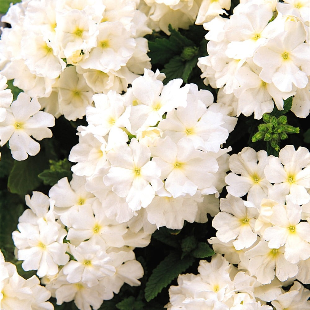 Плотные соцветия с молочно белыми цветами, расположены так часто, что почти не видно листьев. Растение компактное около 20 см высотой. Великолепно смотрится в бордюрах, балконных ящиках, подвесных корзинах, особенно в смеси с вербенами другого цвета.